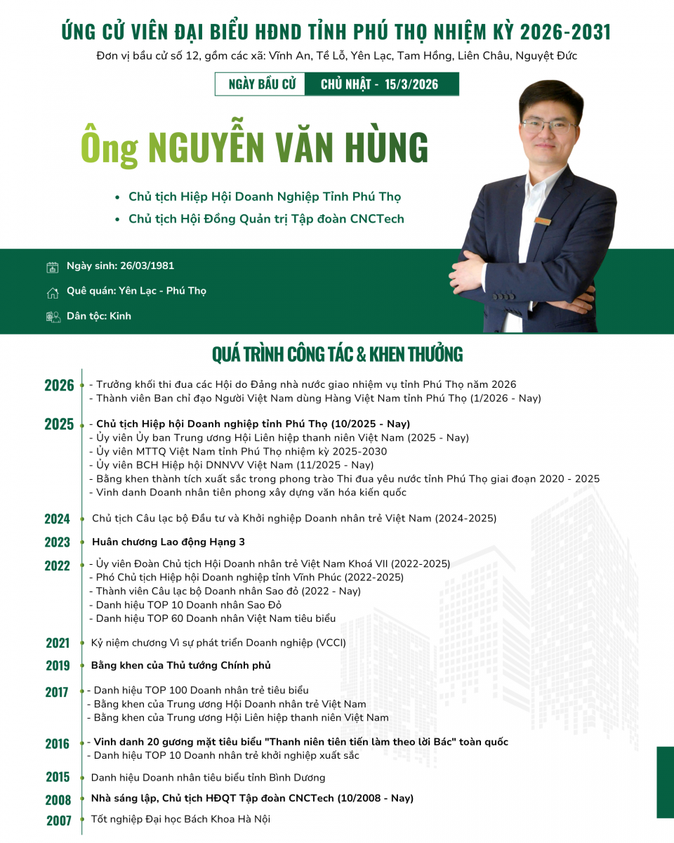 Với niềm tin và kỳ vọng vào chặng đường phát triển mới của tỉnh, Hiệp hội Doanh nghiệp tỉnh Phú Thọ vinh dự có đại diện tham gia ứng cử đại biểu Hội đồng nhân dân tỉnh: Ông Nguyễn Văn Hùng, Chủ tịch Hiệp hội Doanh nghiệp tỉnh Phú Thọ, đồng thời là Chủ tịch CNCTech Group.