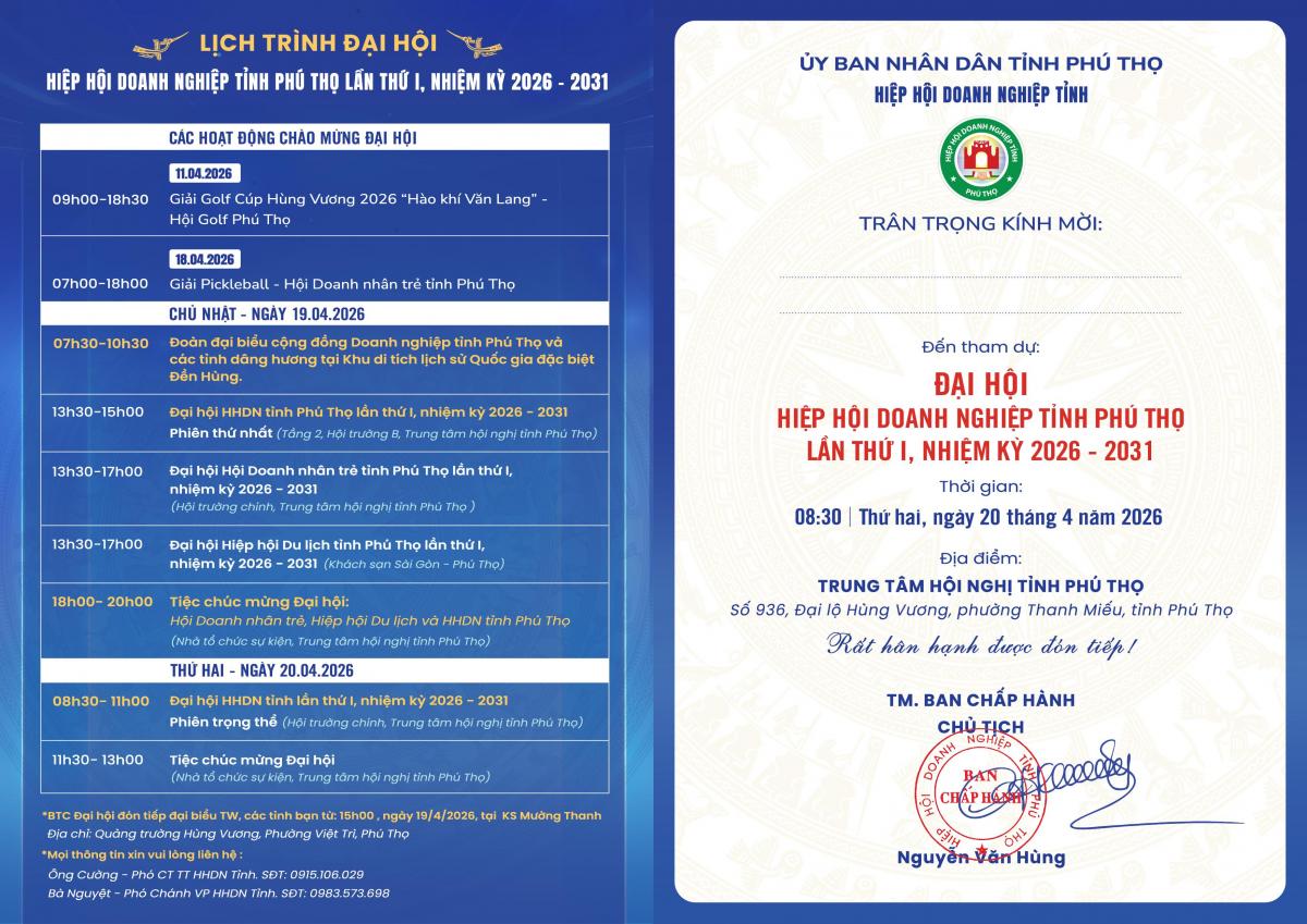 Trong bối cảnh tỉnh Phú Thọ đang bước vào giai đoạn phát triển mới với nhiều cơ hội và dư địa bứt phá, cộng đồng doanh nghiệp ngày càng khẳng định vai trò là lực lượng nòng cốt trong phát triển kinh tế - xã hội, Đại hội Hiệp hội Doanh nghiệp tỉnh Phú Thọ lần thứ I, nhiệm kỳ 2026 – 2031 được tổ chức là sự kiện có ý nghĩa đặc biệt quan trọng.